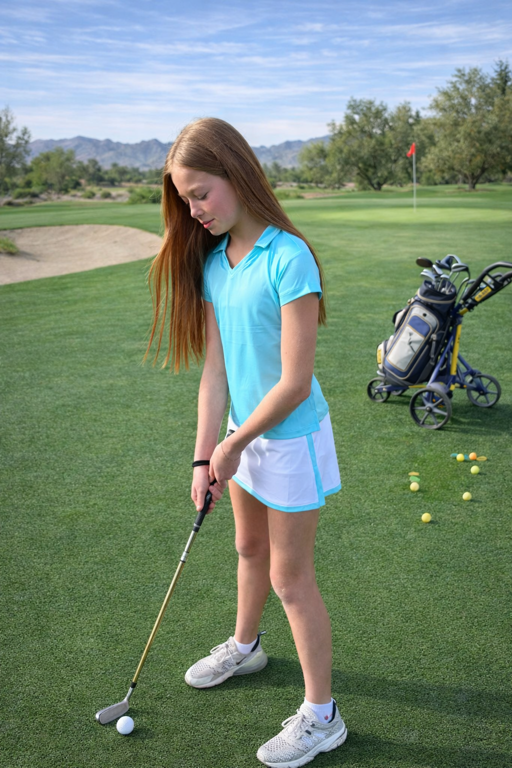 Modern straight white skirt with aqua ocean border and side slits, built-in compression shorts. Perfect for tennis, golf, dance or school.
