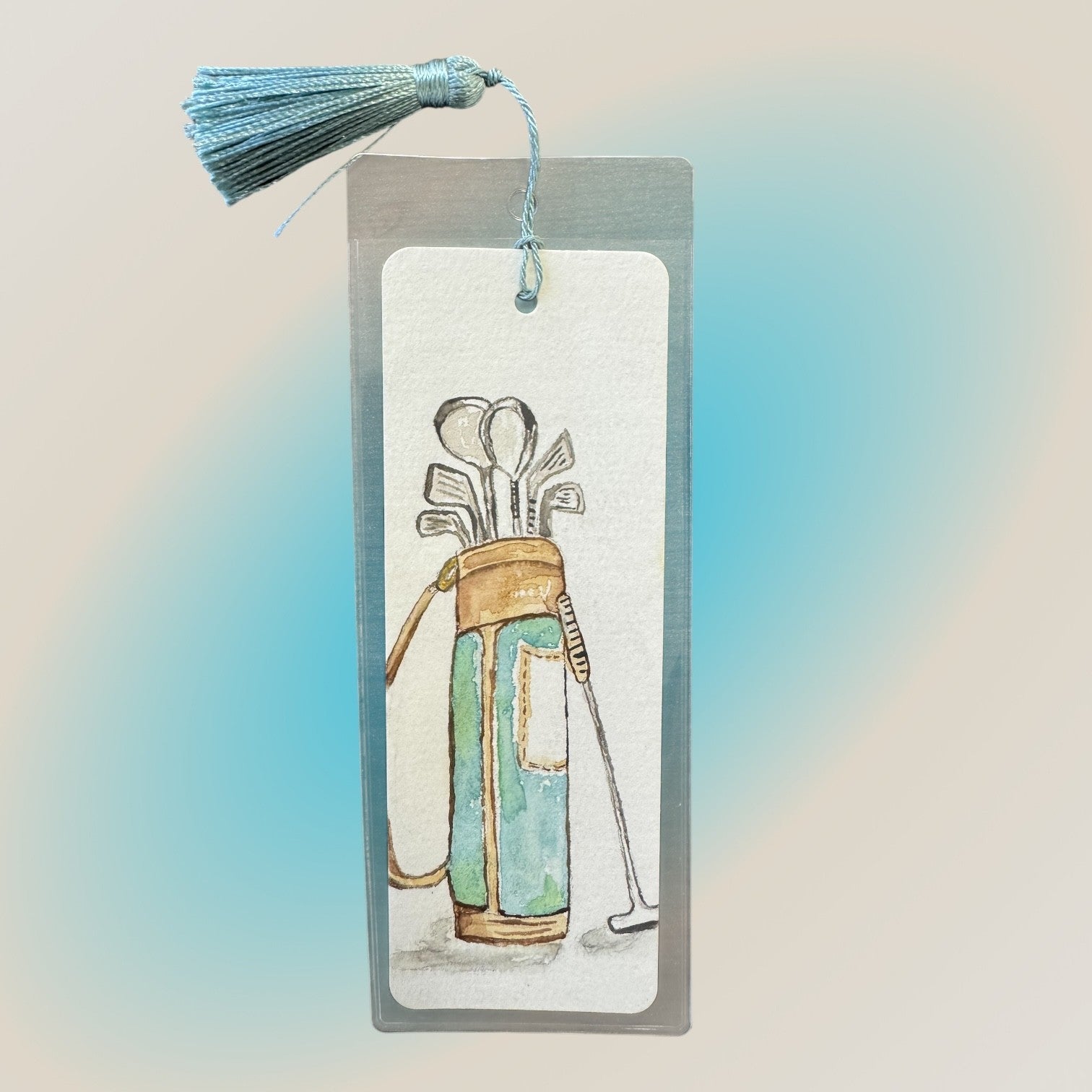 Individually hand-crafted and watercolored Golf Clubs bookmark. Each bookmark is one of a kind on heavy stock cotton watercolor paper. Bookmark comes with light blue tassel and plastic protective pouch, 6.25 X 2.25 in.